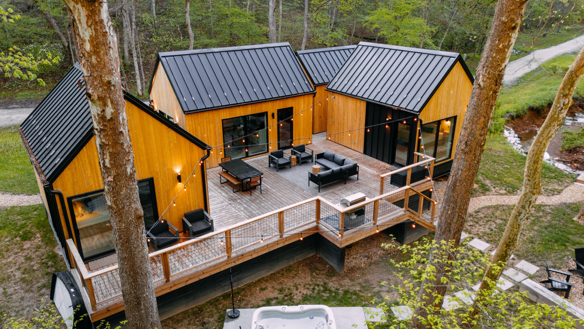 Creek Cabin is a deconstructed cabin — the kitchen and living area are in a separate building from the bedrooms. Bathrooms are located in the bedroom buildings. Guests sleeping on the sleeper sofa will need to walk outside to access a bathroom.