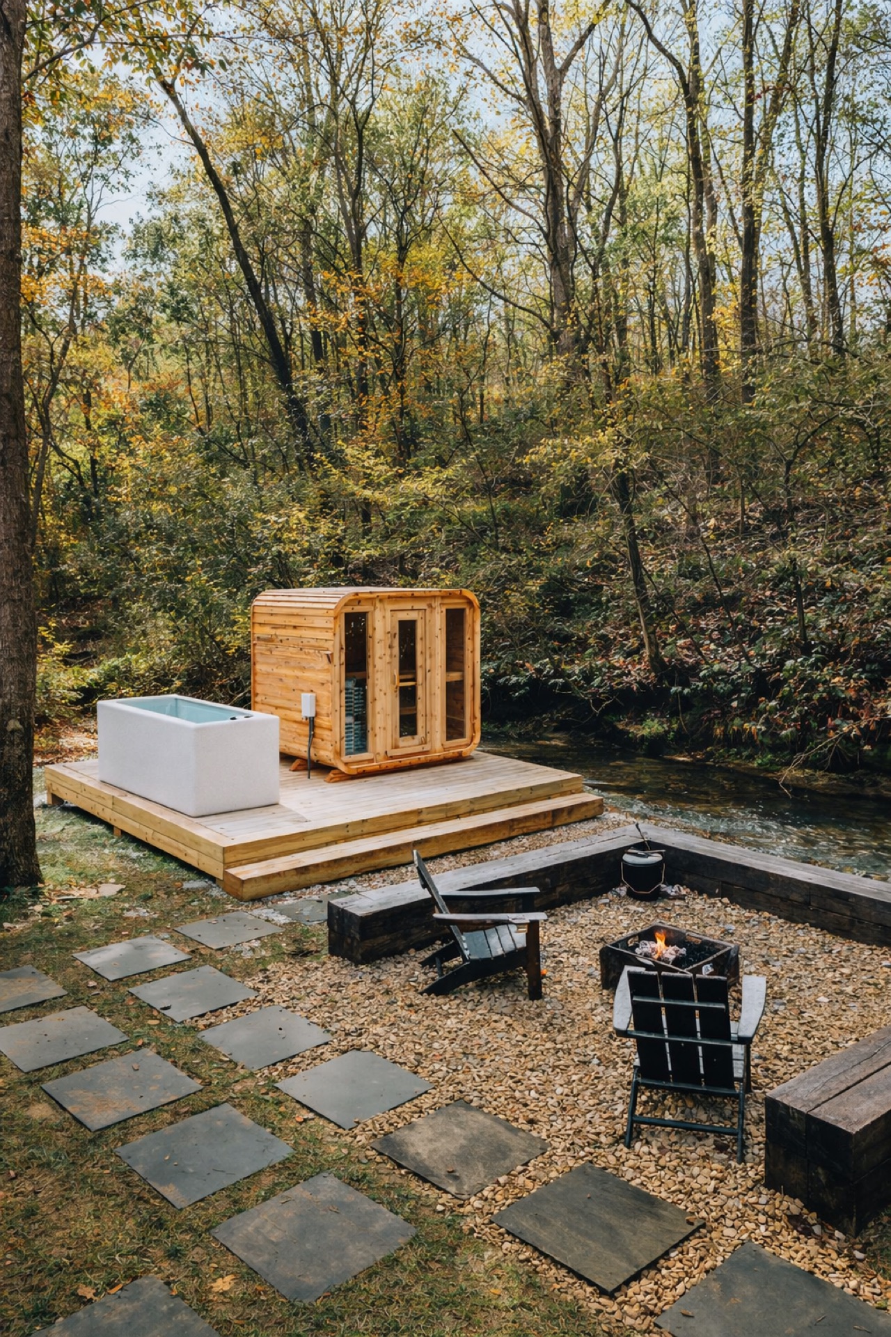The interior is designed for deep rest: low lighting, rich textures, and a layout that draws you from morning coffee to afternoon sauna to evening stillness on the deck. The private cold plunge sits just steps from the water's edge.