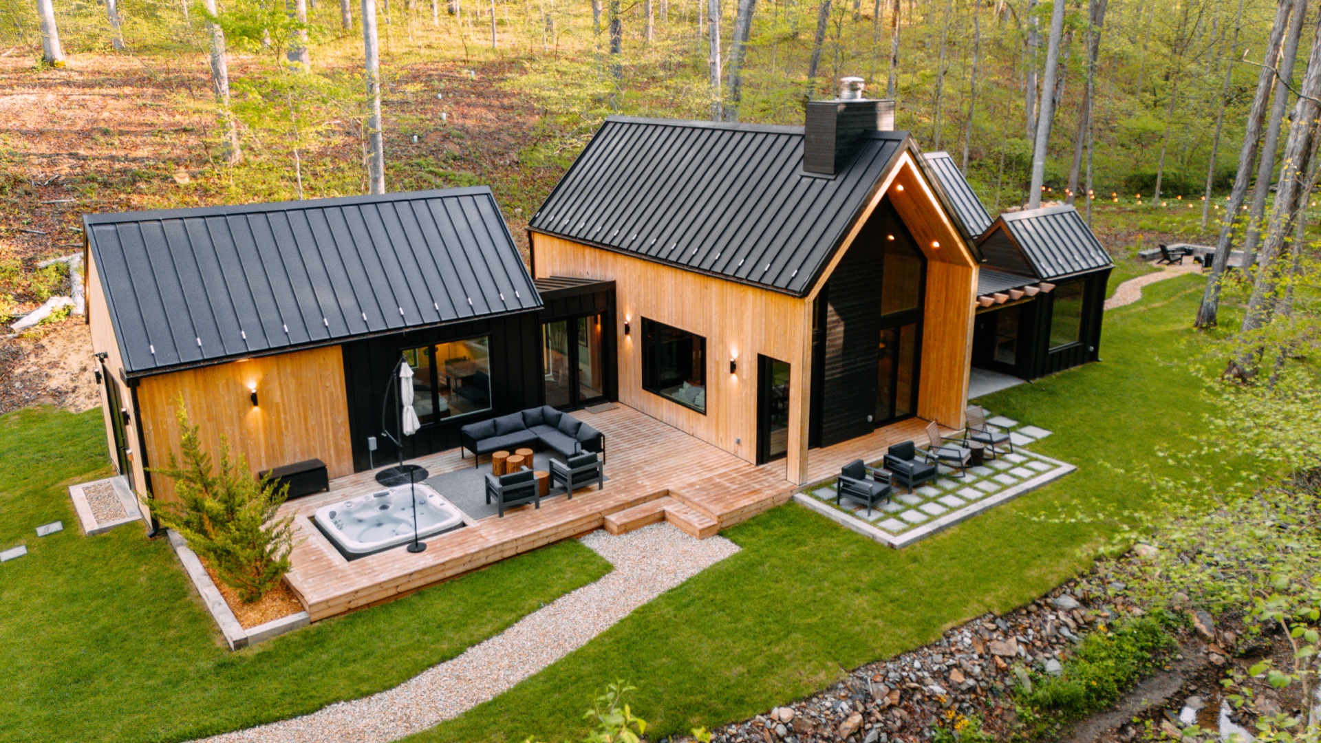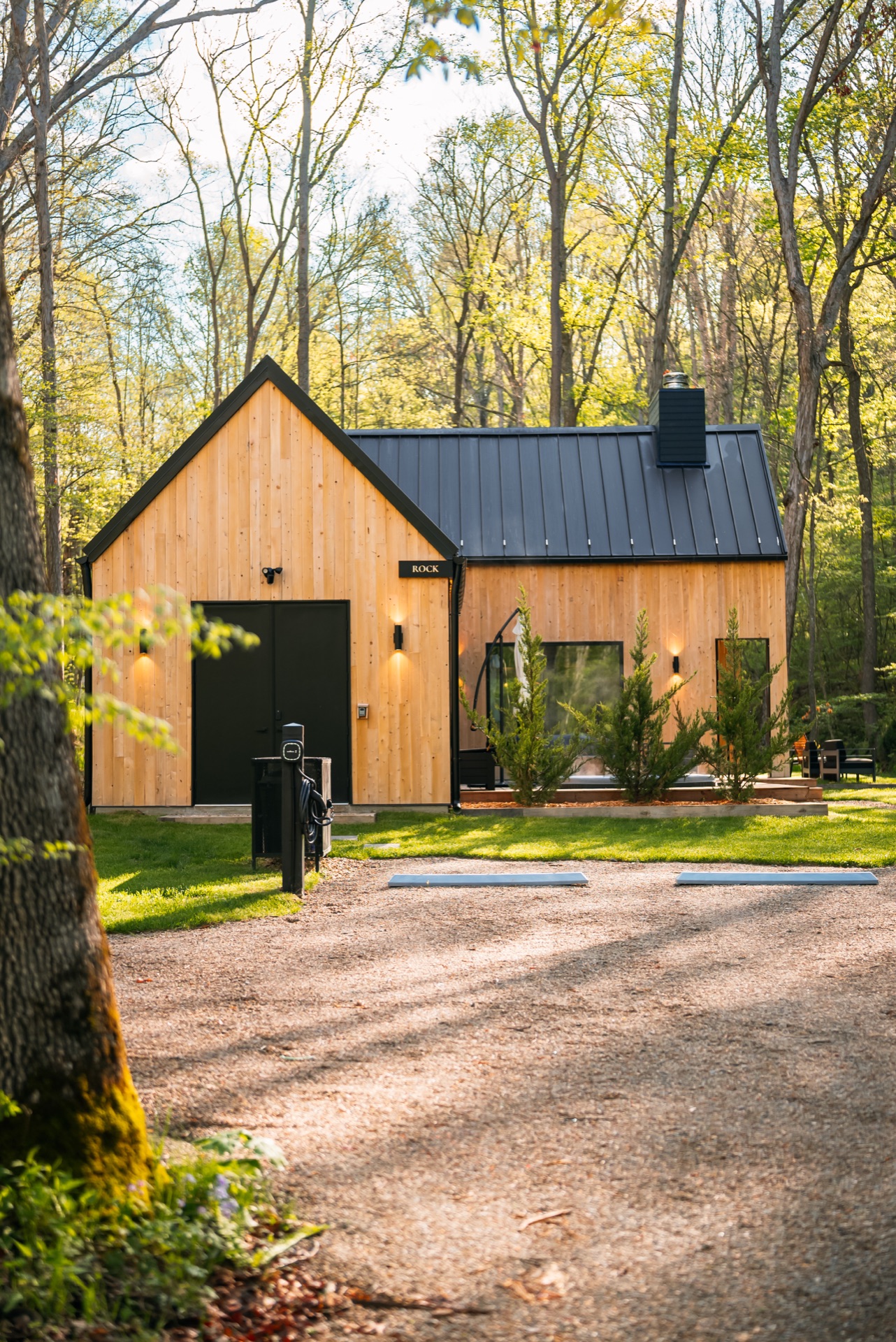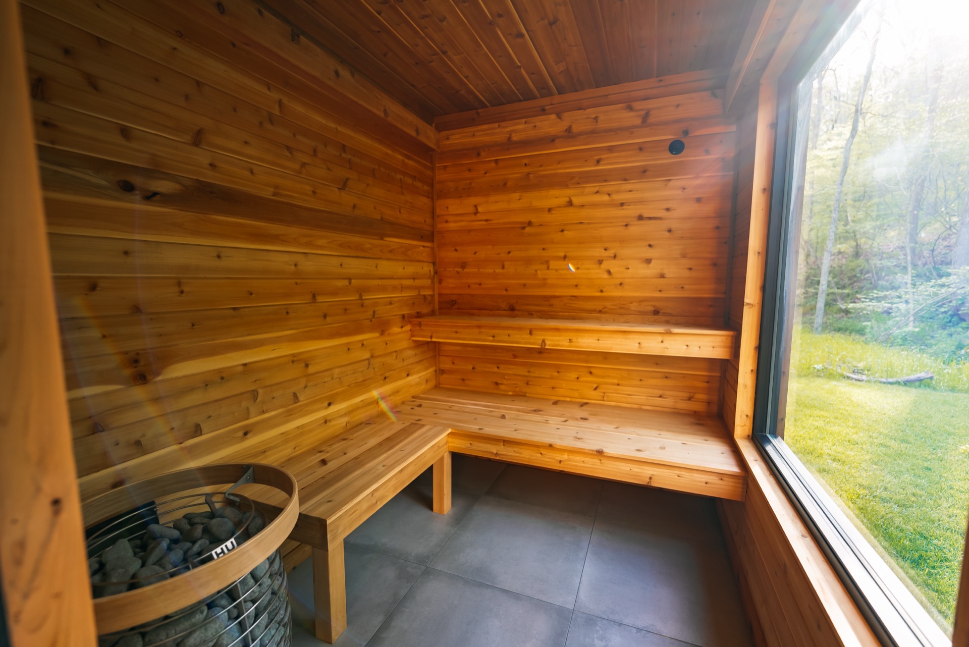 Inside, the design is warm and considered: exposed wood, natural stone accents, and windows positioned to bring the outside in. Outside, your private sauna and cold plunge await alongside direct access to Hugga's trail network.